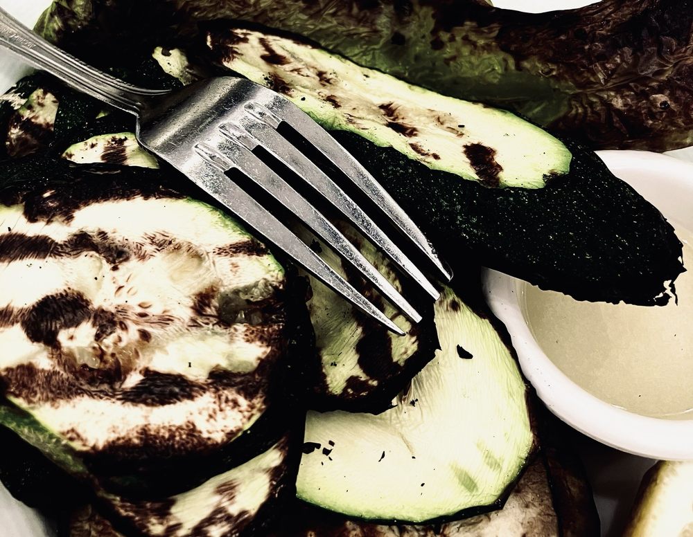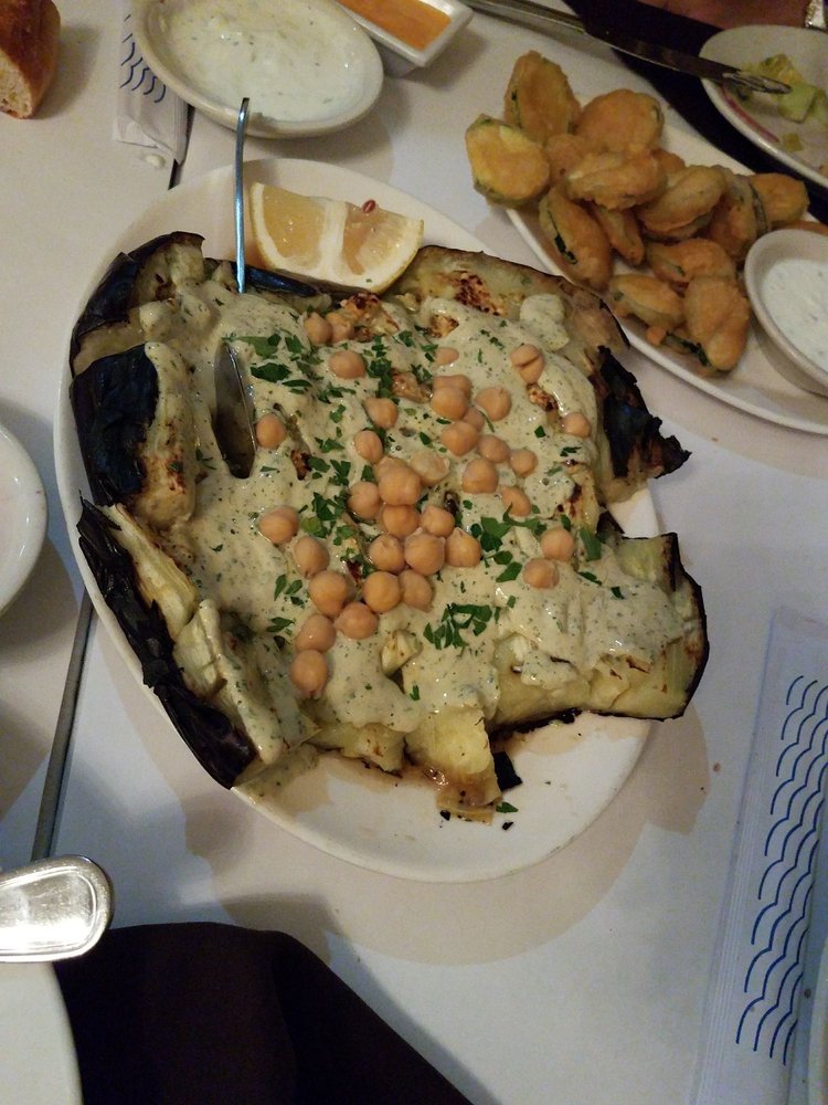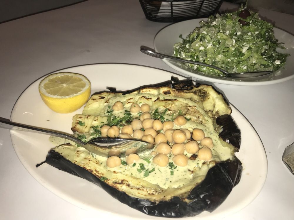 Fire roasted eggplant with chickpeas, tahini, lemon, garlic and parsley (Please allow 25 minutes)