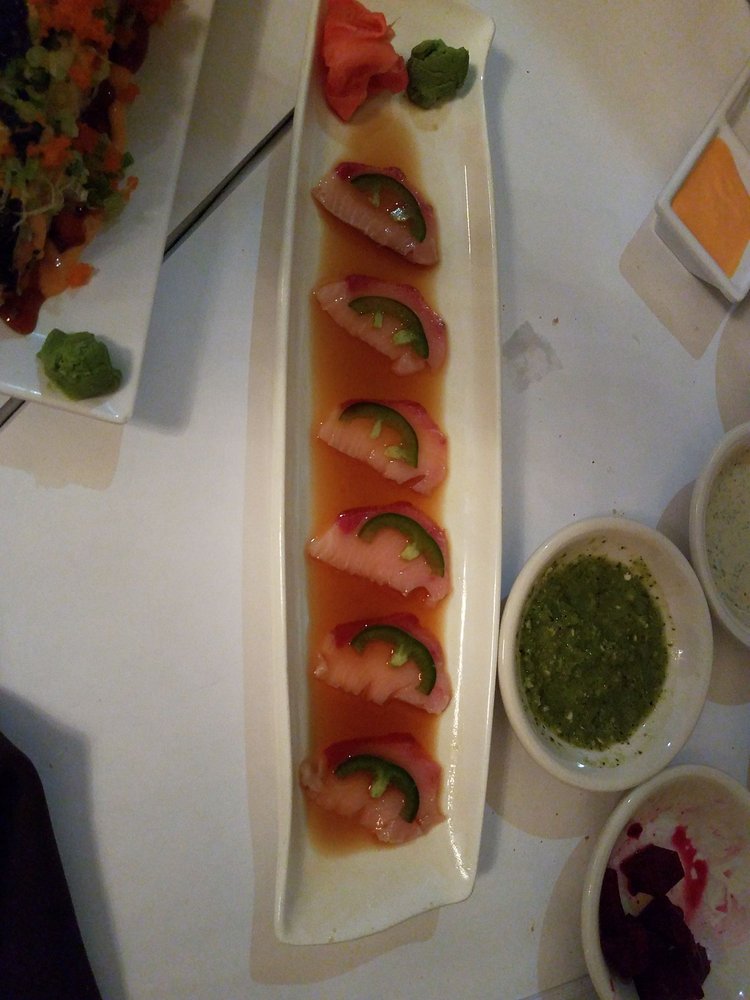 Thin sliced Yellowtail with shaved jalapeno, green apple and cilantro Dressed with soy sauce and lime vinaigrette